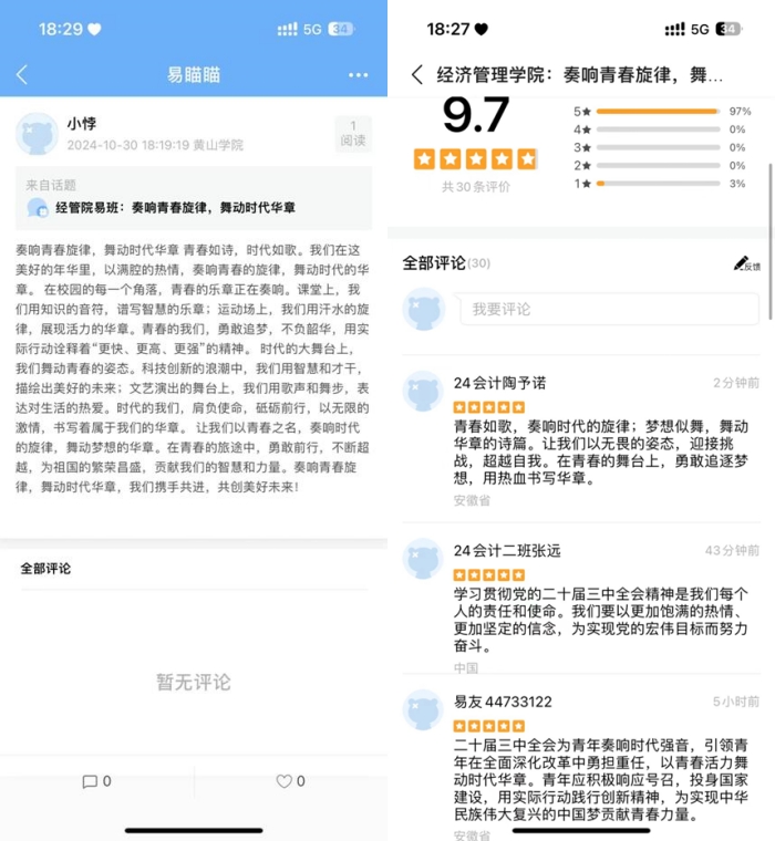 10月31日,伟德BETVlCTOR1946在线登录平台学生会团支部举办“奏响青春旋律、舞动时代华章”主题团日活动,组织团员和青年在易班APP浏览轻应用、发布易瞄瞄,交流全会精神学习感悟,加强思想政治引领和价值引领。